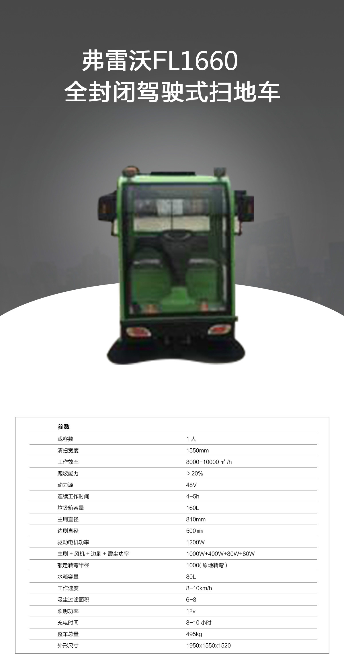 產(chǎn)品分類:駕駛式掃地機產(chǎn)品特點:1、全封閉駕駛式掃地機1660特有出口型免維護電瓶,區(qū)別于市面上其他電動掃地機,其智能型充電機能有效延長電瓶使用壽命,可使連續(xù)工作時間更長。2、全封閉設(shè)計保護工作人員身心健康。3、底部主刷和兩側(cè)邊刷可自由調(diào)節(jié)高度使清掃效率更高,清掃寬度達到1550mm,完成1000㎡的地面清掃工作僅需6分鐘,比傳統(tǒng)人力清掃效率提高幾十倍,并且還能節(jié)省人力成本,省時省力、更省錢!4、控制面板友好,操作簡單、易懂,使用前工作人員無需特別培訓(xùn),“保潔大媽也能輕松操作完成清掃任務(wù)”。5、配備的優(yōu)良吸塵系統(tǒng)能夠有效抑制揚塵的產(chǎn)生,避免二次污染。適用環(huán)境:車站、機場、物業(yè)小區(qū)、倉庫、車間、園區(qū)、廣場、學(xué)校、醫(yī)院、商場、公園、市政單位、街道等公共場所地面。